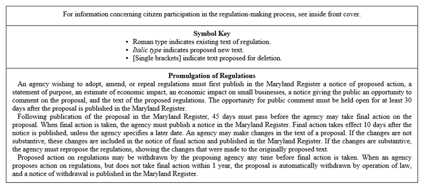 Maryland Regulations. Any change to the text of regulations published in COMAR, whether by adoption, amendment,